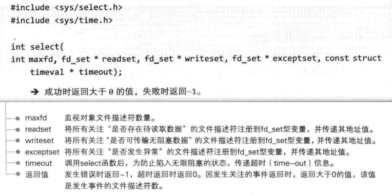 - 超时后, select 函数返回0。 因此,可以通过返回值了解返回原因