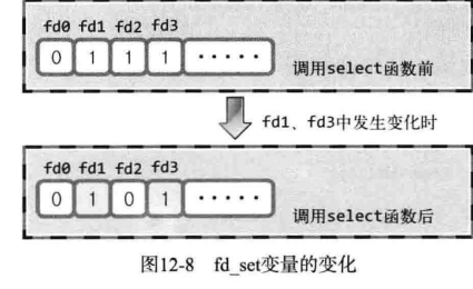 - select函数调用完成后,向其传递的fd_set中将发生变化, 原来为1的所有位均变为0 ,但发生变化的文件描述符对应位除外。 因此,可以认为值仍为 1的位置上的文件描述符发生了变化。