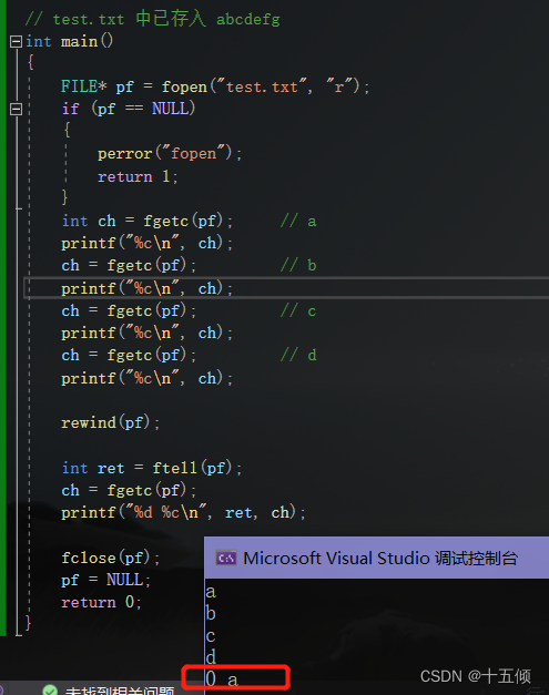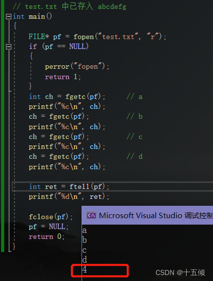 可见,在文件指针向右偏移4后,再使用fseek将文件指针向左偏移4后,文件指针再次指向了起始位置。