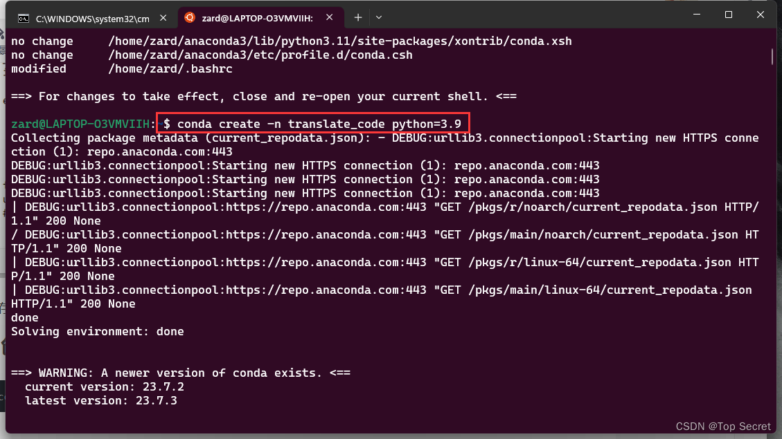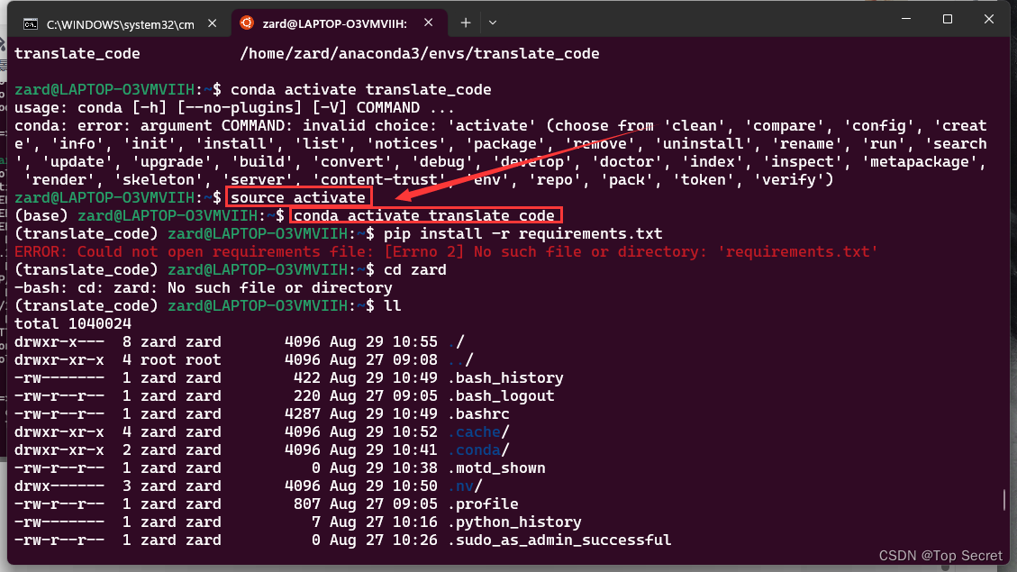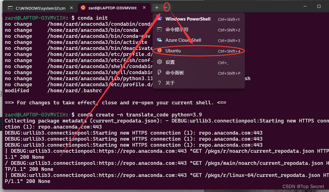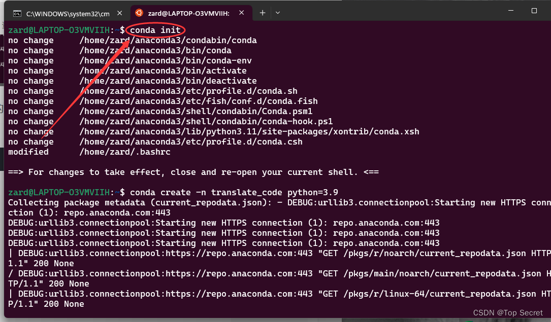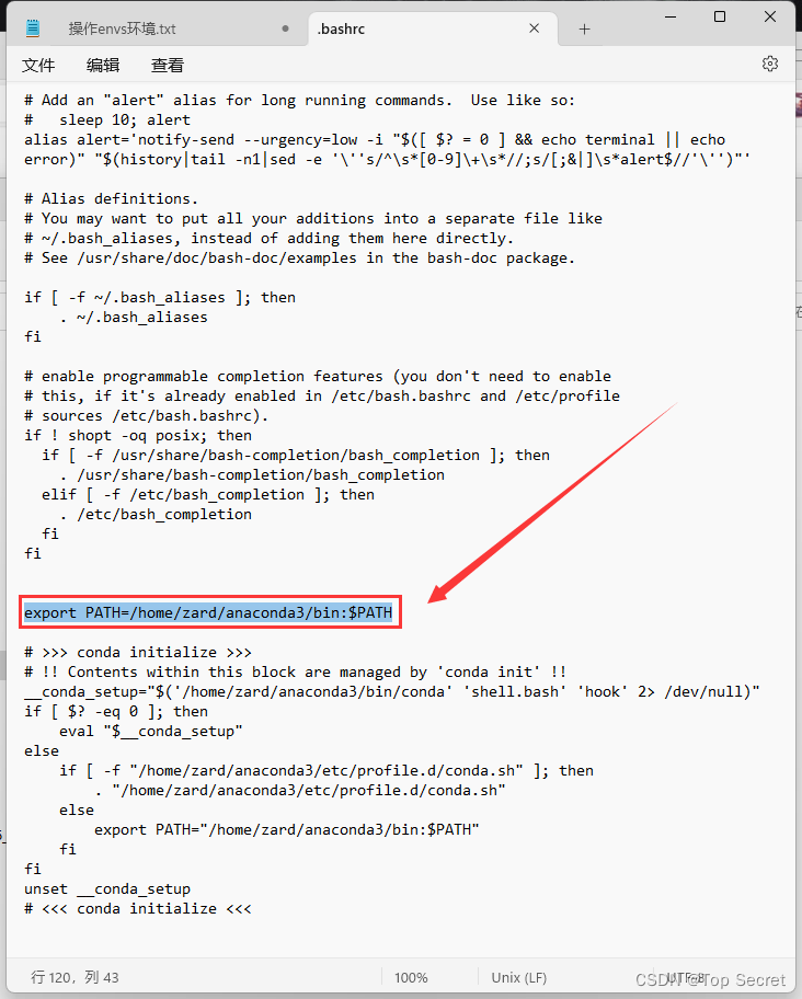 如果提示说找不到或者conda命令无效,那就需要在.bashrc文件中添加如下代码(安装的conda的环境变量):