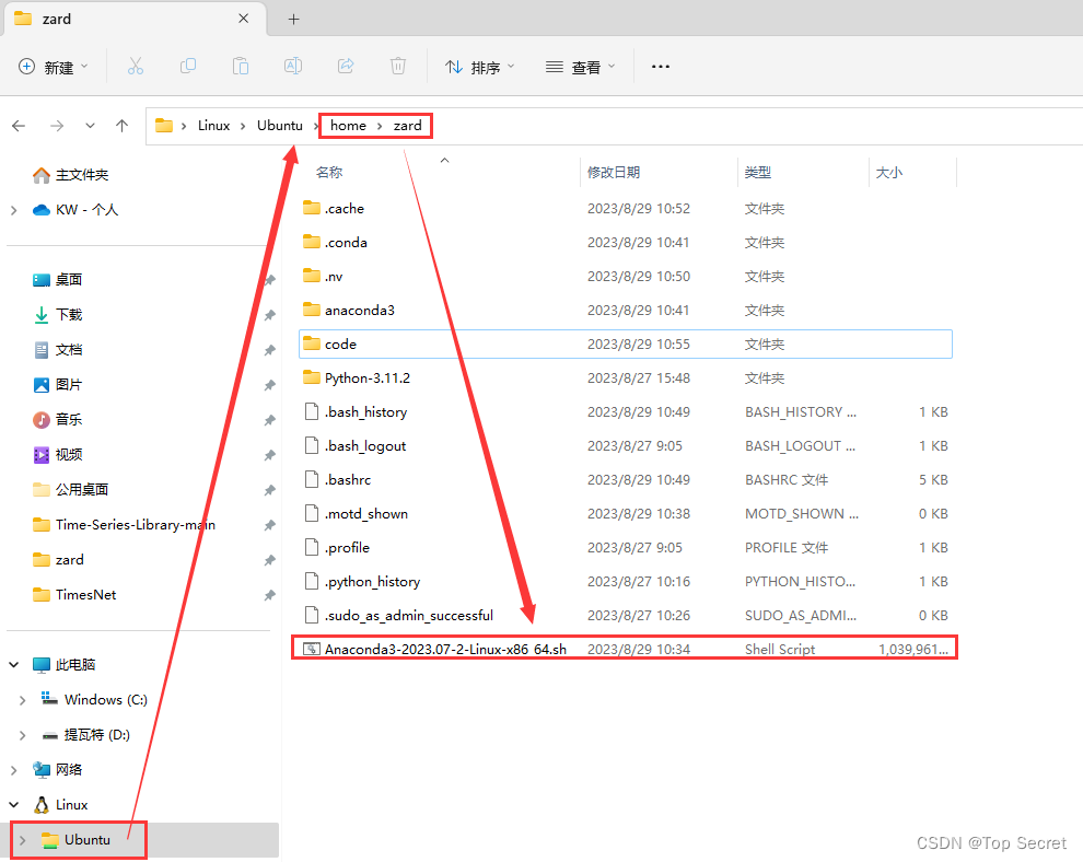 将下载完毕的anaconda文件拖到linux的home目录下的用户文件夹(zard)中:
