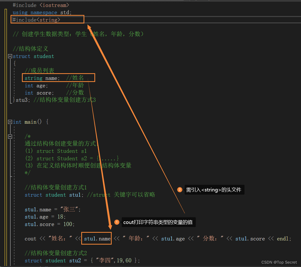 cout << "主函数中 姓名:" << stu.name << " 年龄: " << stu.age << " 分数:" << stu.score << endl;