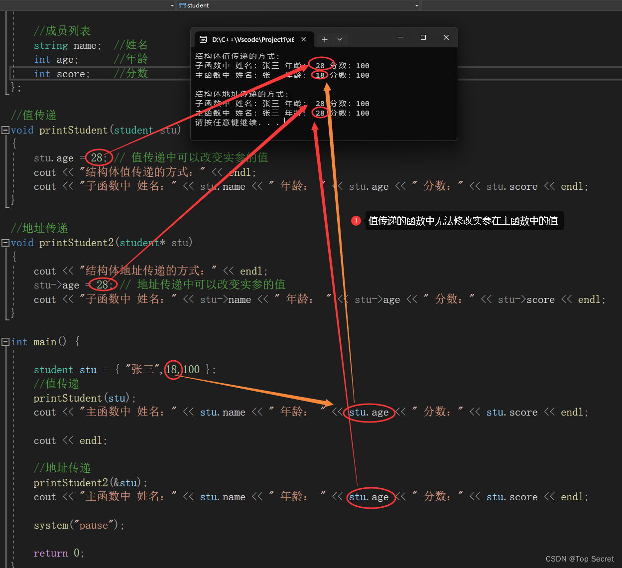 stu.age = 28; // 值传递中可以改变实参的值