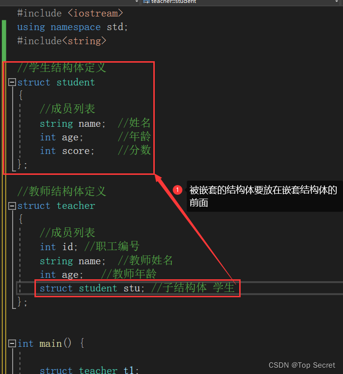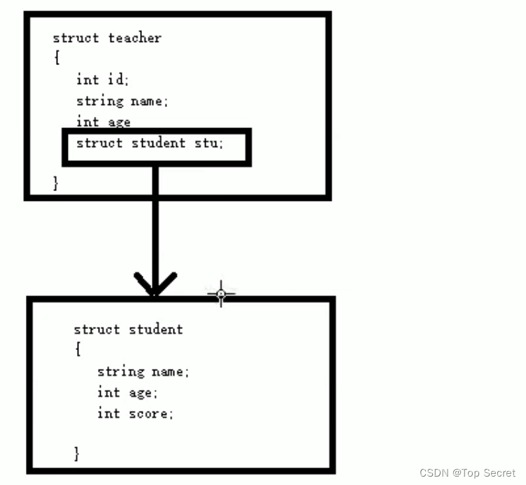 例如:每个老师辅导一个学员,一个老师的结构体中,记录一个学生的结构体