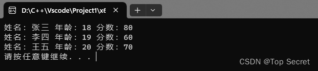 cout << "姓名:" << arr[i].name << " 年龄:" << arr[i].age << " 分数:" << arr[i].score << endl;
