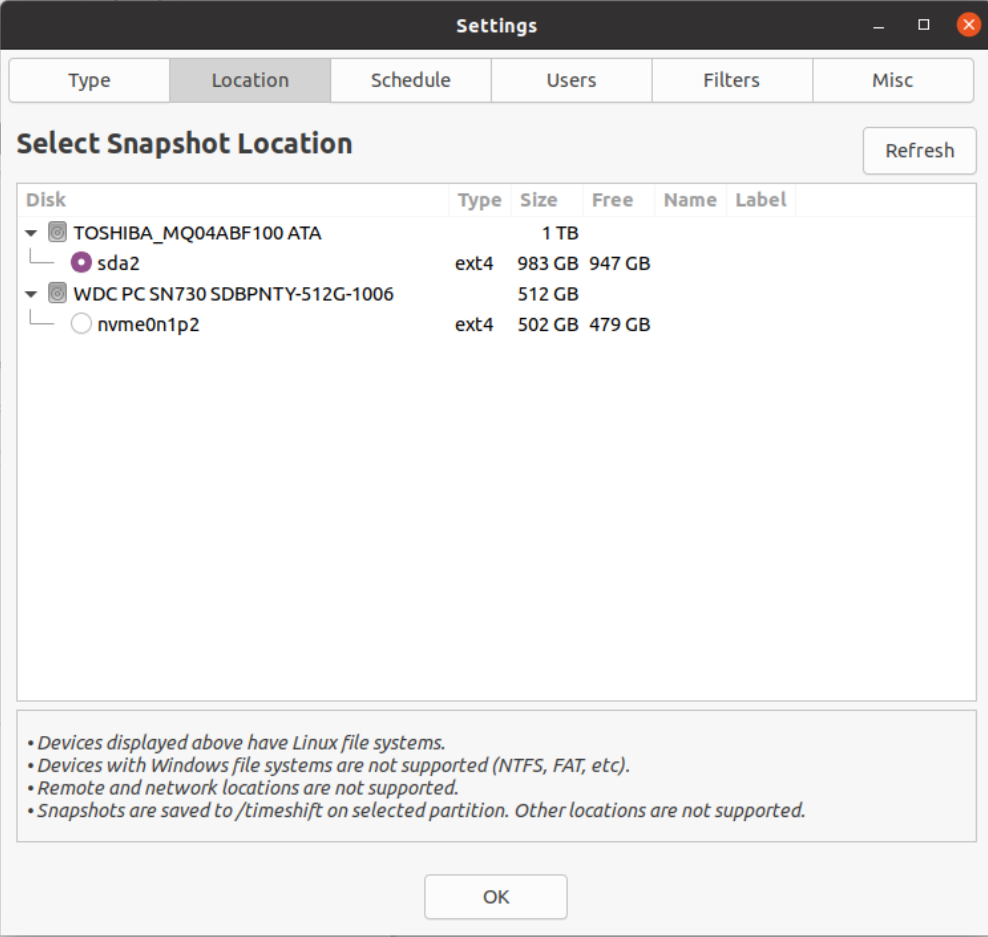 注释:磁盘名可以通过 `fdisk -l` 或 `df -TH` 来查看。备份位置最好选择在非系统硬盘或移动U盘。选好盘后备份数据默认会保存在该硬盘下根目录下的 `/timeshift` 目录下。