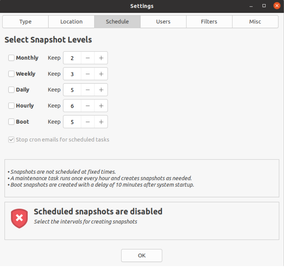 其他:”Stop cron emails for sheduled tasks”:一般勾选×,不然TimeShift会每小时发送一份系统邮件到邮箱。