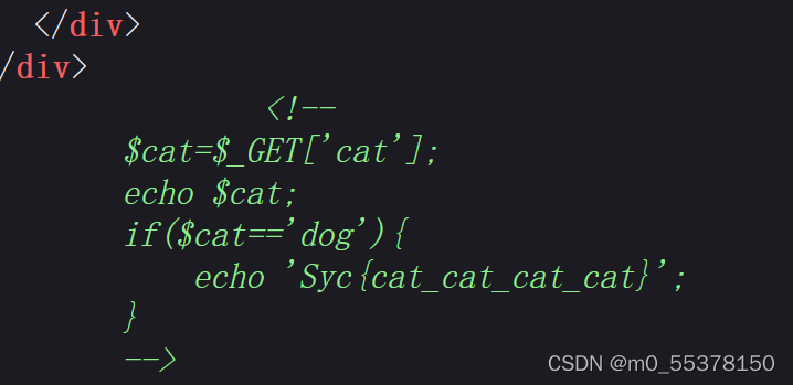 没啥好说的,用get方式传入cat的值为dog,就能打印出一个类似flag的东西,直接上payload:?cat=dog