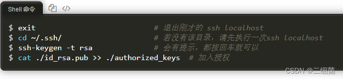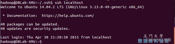 此时再用 ssh localhost 命令,无需输入密码就可以直接登陆了,如下图所示。