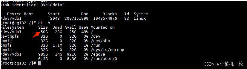 1、查看系统盘内存 df -h ,需要把/dev/vda1 盘扩容