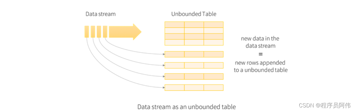 把输入数据流当做输入表(Input Table). 到达流中的每个数据项(data item)类似于被追加到输入表中的一行。