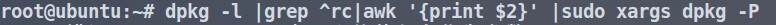dpkg -l |grep ^rc|awk '{print $2}' |sudo xargs dpkg -P