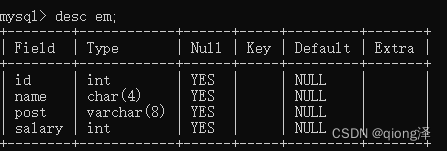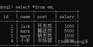 为实现上述聚合函数,这里创建employees表,利用insert关键字添加数据,再使用select关键字查询数据结果验证聚合函数的功能。