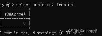 使用sum()函数。如果sum操作的数据类型是字符,不是数字类型,则会返回一个0值。且下面也有警告信息出现。