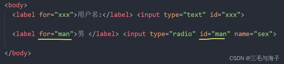 核心 : <label> 标签的 for 属性 应与 相关元素的 id 属性相同 。 ( 里面的值要一样 )