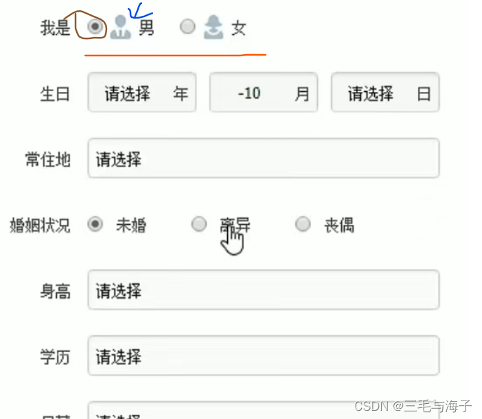 就是说,如上示,我们在进行选项的选择操作时( 比如,男,女 )