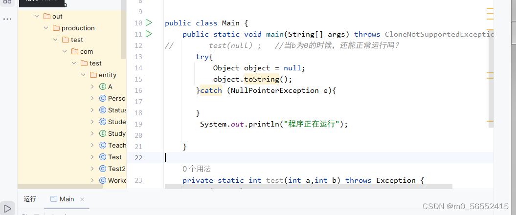使用try-catch,只要是这个范围内发生的异常,都可以被捕获,这里捕获的是NullPointerException空指针异常。