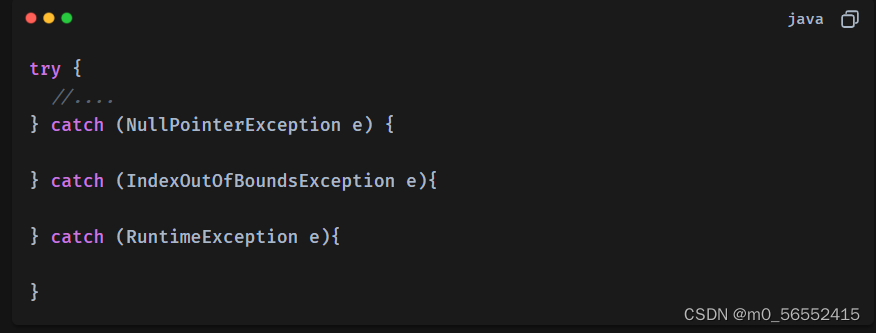 代码可能出现多种类型的异常时,希望分不同情况处理不同的异常,可以使用多重异常捕获。
