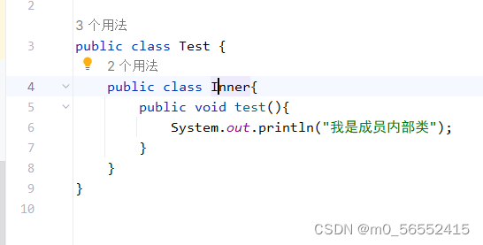 System.out.println("成员内部类的name = "+this.name); //在内部类中使用this关键字,只能表示内部类对象