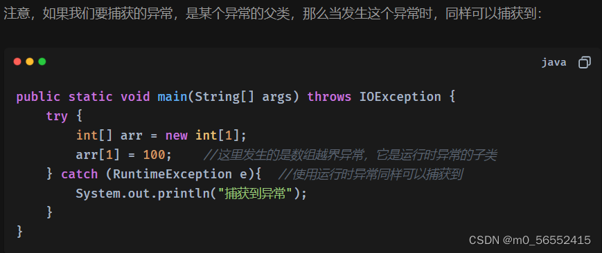 注意,catch中捕获的类型只能是Throwable的子类,也就是说要么是抛出的异常,要么是错误,不能是其他的任何类型。