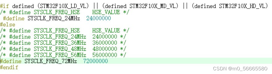 3、在该函数中找到设置的时钟频率对应选项。在以72MHz为例如图4所示。由于定义了“SYSCLK_FREQ_72MHz”是的系统时钟频率为72MHz。其他频率同理。
