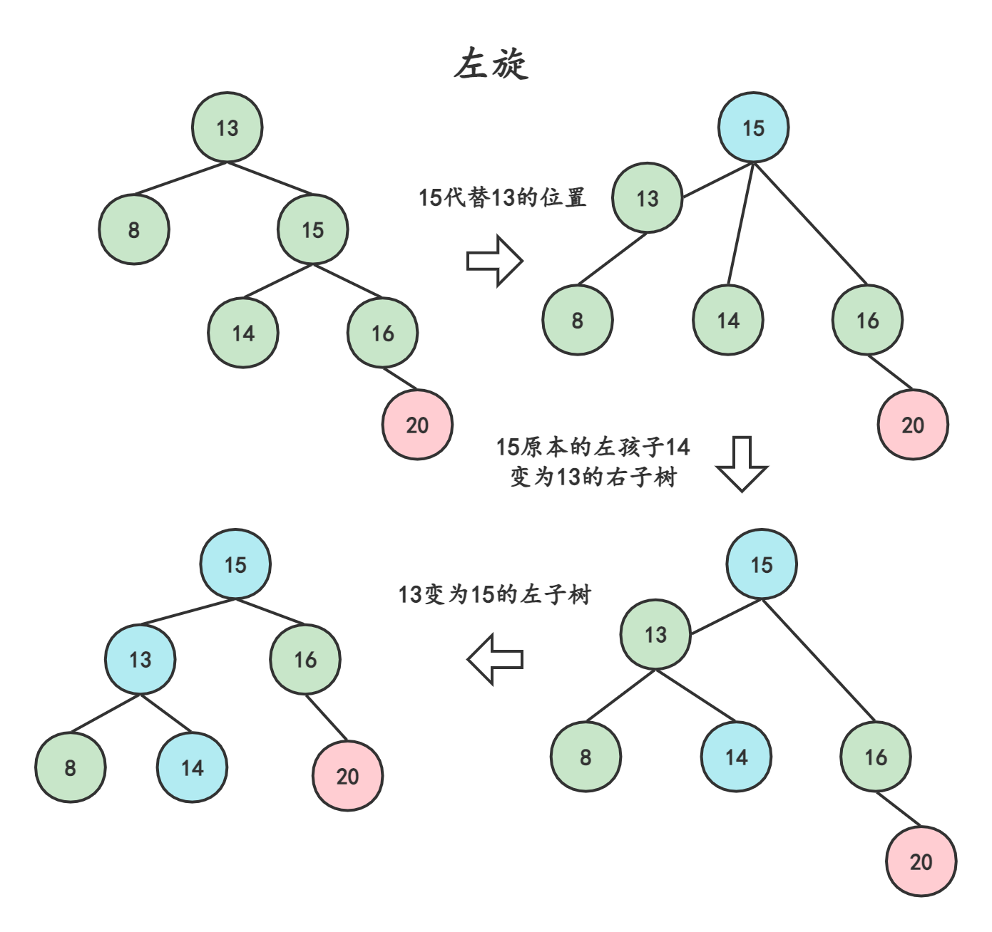 通过上述操作,我们把15向上旋转了,让原本的父节点13作为了15的左孩子,此时就变成了三叉树,需要将15原本的左子树接到13的右孩子处(这样,15也是二叉树,14的位置也是对的)