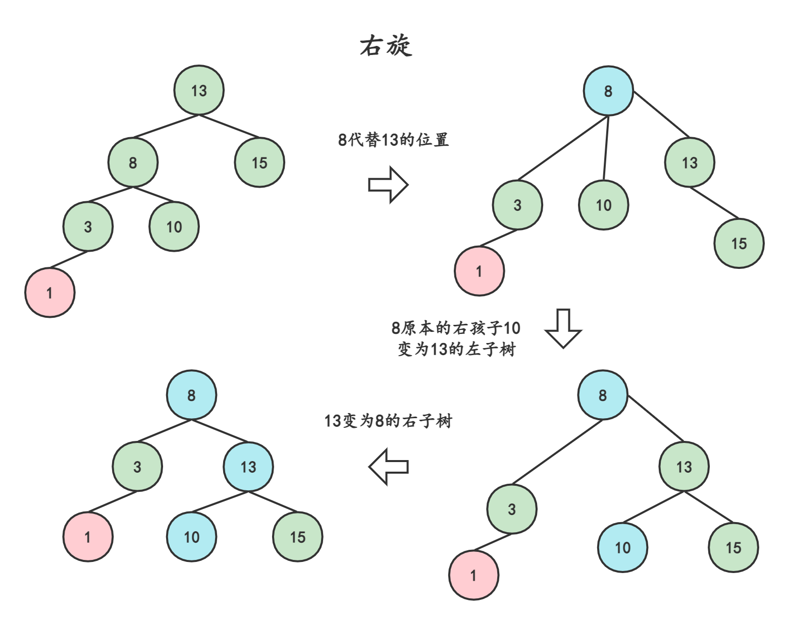 通过上述操作,我们把8向上旋转了,让原本的父节点13作为了8的右孩子,此时就变成了三叉树,需要将8原本的右子树接到13的右孩子处(这样,8也是二叉树,10的位置也是对的)