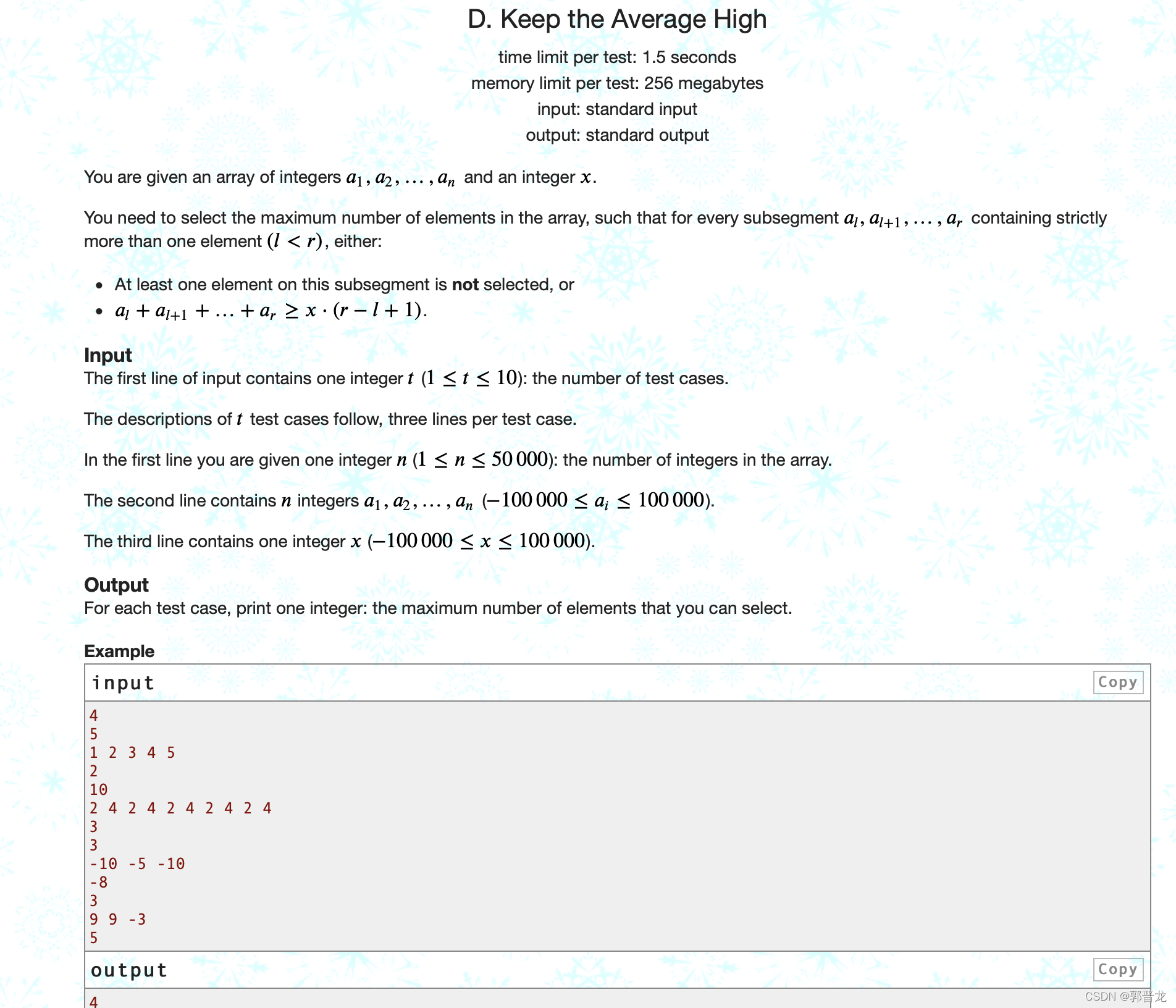 题意就是从给出的数学序列里找出x个数字 然后这个x个数字的序列中 任意区间和都满足一个关系 区间元素不少于二个