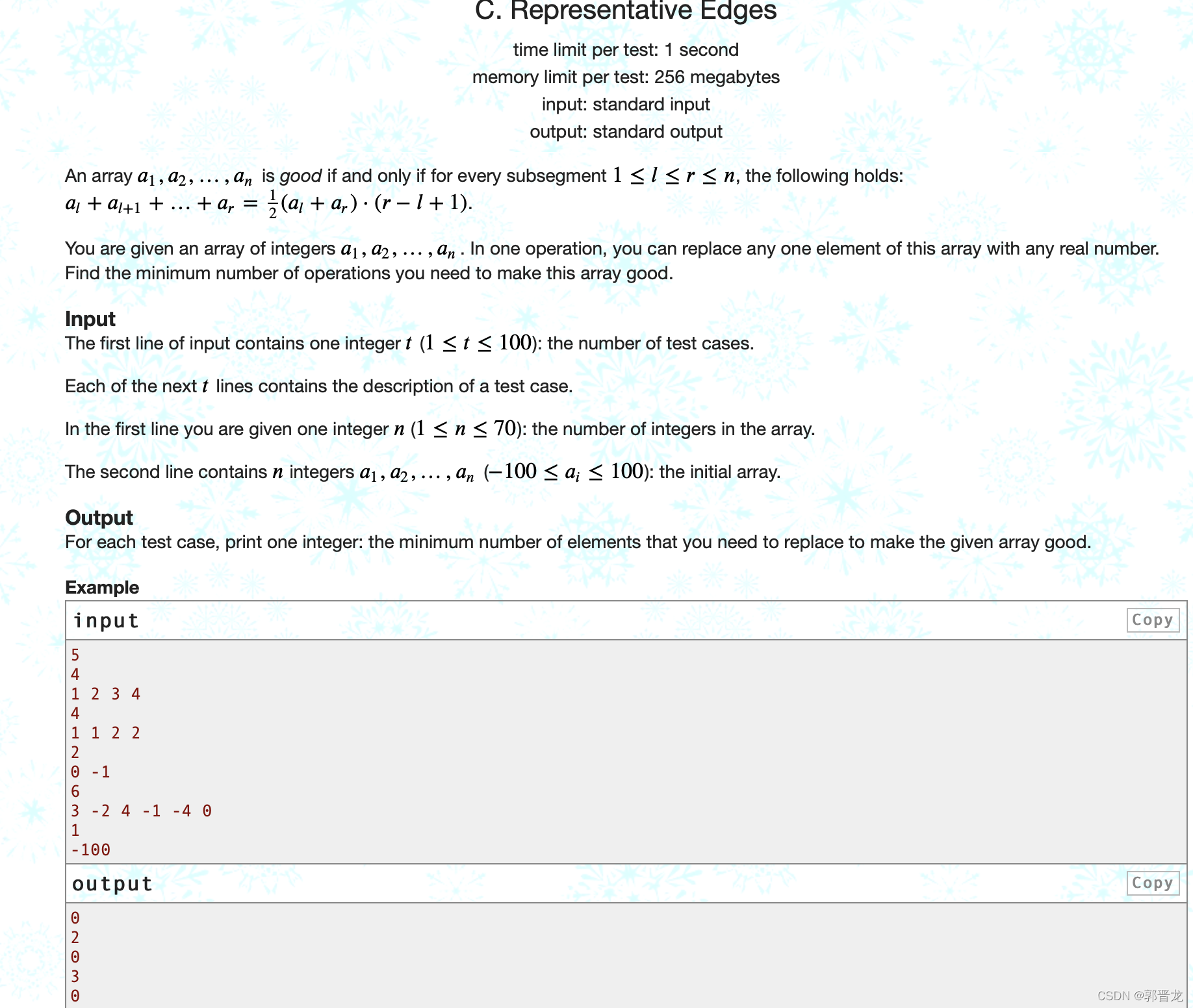 本文探讨了四个关于数字序列操作的问题:IntegerDiversity通过改变符号最大化不同数目的个数,MirrorintheString寻找最小字典序的字符串镜像,RepresentativeEdges构造等差序列的最少操作,以及KeeptheAverageHigh确保选中的数字序列满足区间和条件。每个问题都提供了独特的算法思路和代码实现。