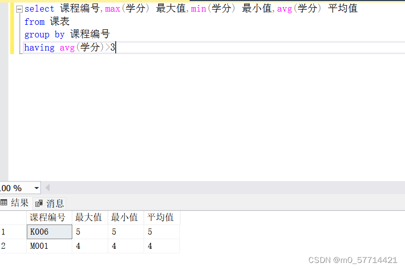在分组查询中,若要实现按照条件过滤分组时,需要使用Having子句来实现。比如在上面的表中实现输出平均值大于3的课程,就直接在group by 子句后加上having avg(学分)>3就行了。结果如下图所示: