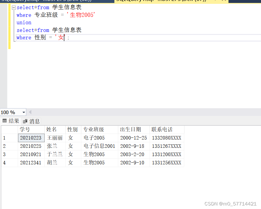 例如:将满足专业是'生物2005'的学生信息和性别为'女'的学生信息查询。