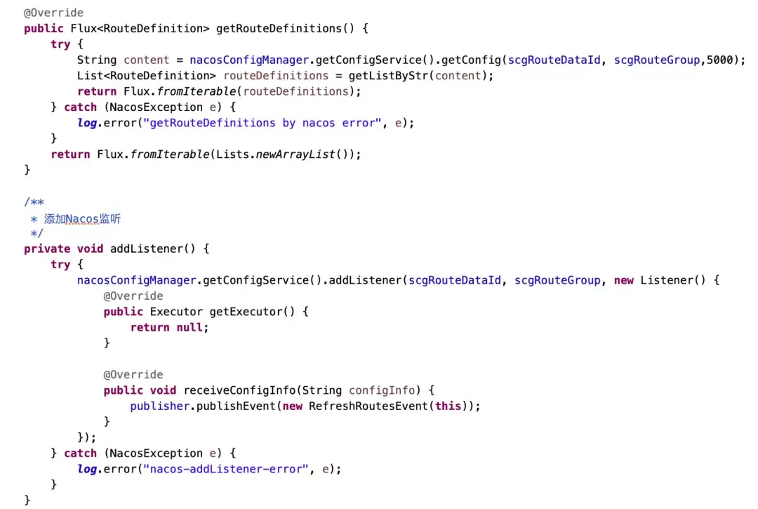 配置Nacos监听器,监听路由配置信息的变化,也是利用api方法,也就是addListener方法;此方法一看就知道,就是用来监听config信息变化的。