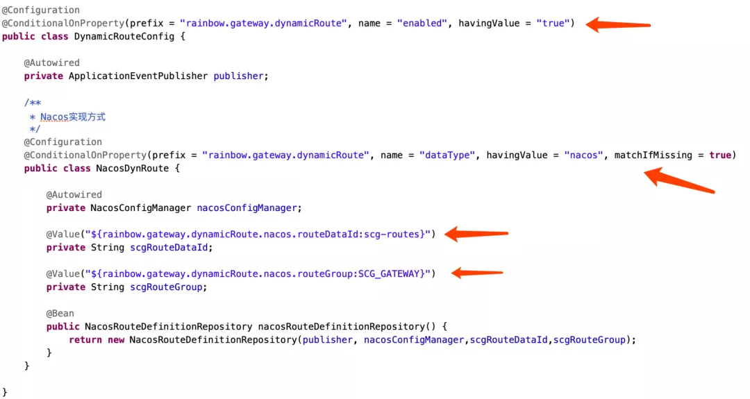 上面的配置类,有两个重要的**@ConditionalOnProperty,这个就是用来控制是否启用动态路由,以及是否用nacos作为存储。**