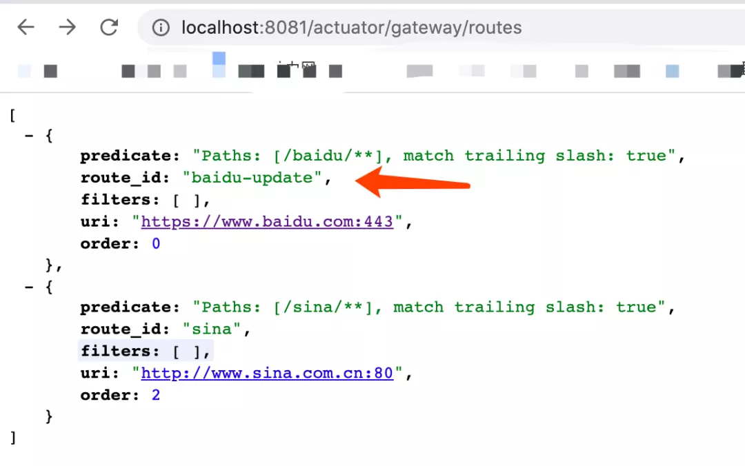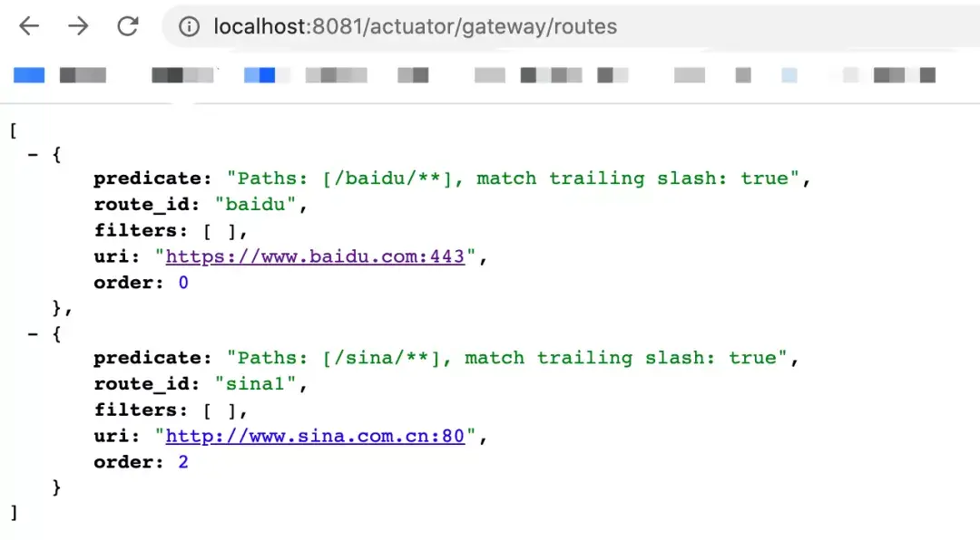 这样我们就可以访问http://localhost:8081/actuator/gateway/routes,就可以看到路由信息