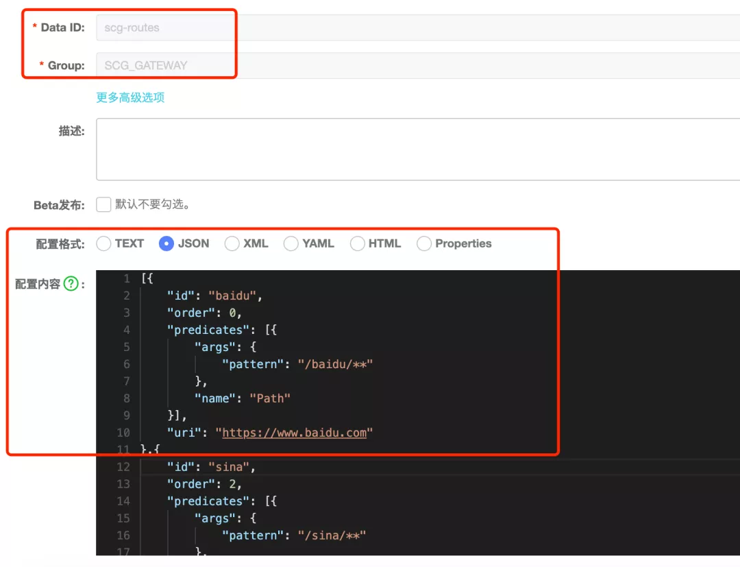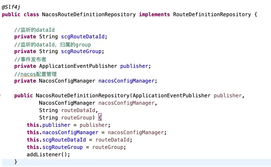 里面还有@Value注解定义我们存储路由信息的DataId和Group,application.yml如果不配置默认值为scg-routes和SCG_GATEWAY