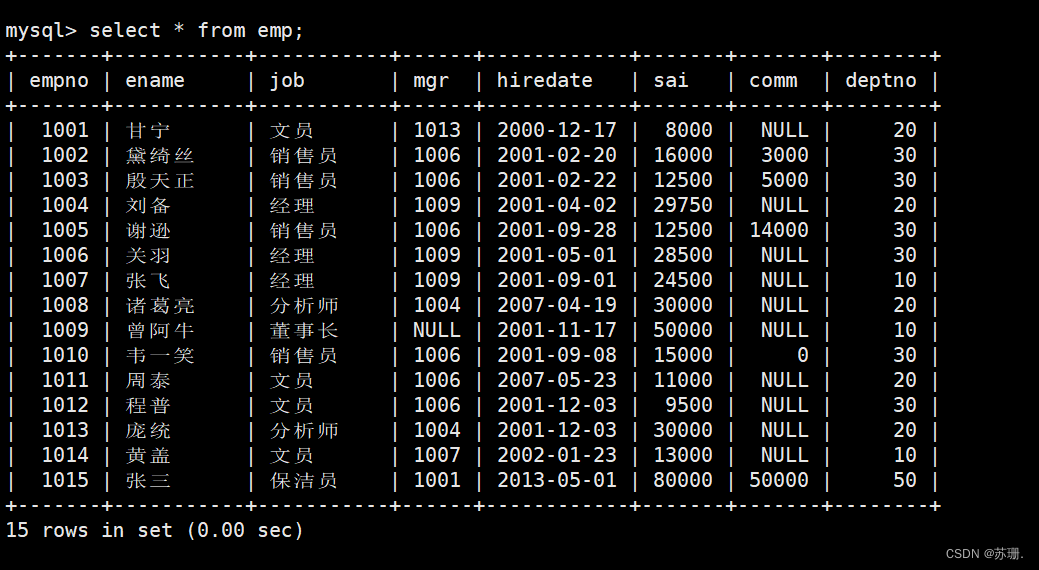1、查询出部门编号为30的所有员工: