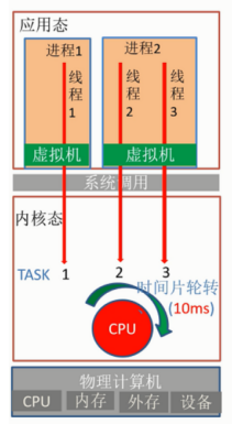 调度器给每个就绪的任务分配一个时间片(quantum),例如 10 ms。当一个任务的时间片用完,调度器就会在就绪队列里挑下一个任务来运行。这个“下一个任务”既可能是同一进程的另一个线程,也可能是完全不同进程的线程。