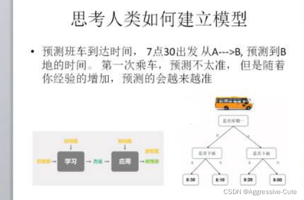 人类通过回忆之前的经历,衍生出经验,对于下次类似的事情就有解决的办法,对应的解决措施。例如:上图的决策树,判断条件 判断结果。通过天气因素,判断车的到达时间,我们就可以通过收集大量的数据,选择一个模型,从而实现预测。