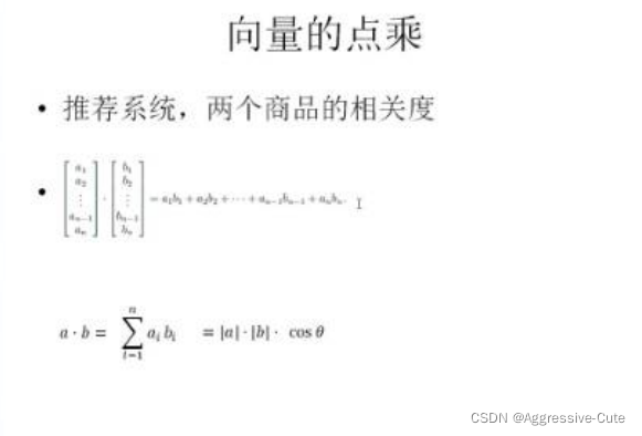 有必要说一下两个向量之间的夹角,如果夹角越小,他的余弦值就越大,代表两个向量就越接近,例如:我们的推荐系统,猜你喜欢,就是根据向量的点乘实现的。两个商品就好像是两个向量,如果他们之间的夹角越小,点乘的结果越大,两个商品就越相似,就越推荐相似的商品给客户。