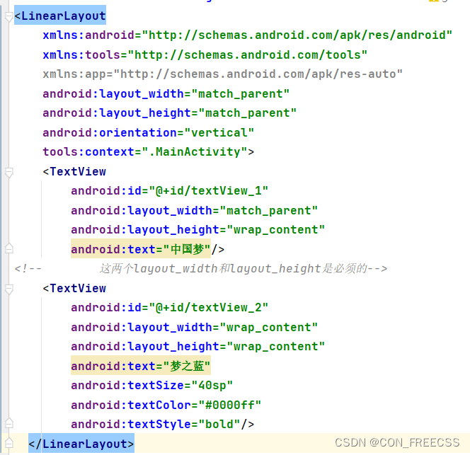 android:layout_width:控件的宽度=“match_parent”匹配父容器宽度/“wrap_parent”自适应宽度