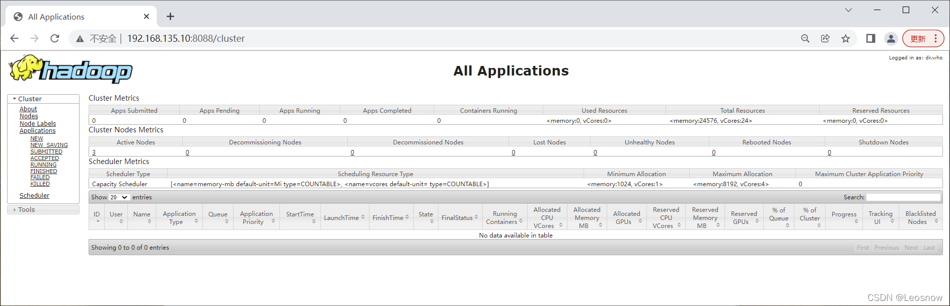 service firewalld stop systemctl disable firewalld.service [root@master ~]# vim a.txt [root@master ~]# hadoop fs -mkdir /input (hdfs dfs ) [root@master ~]# hadoop fs -put a.txt /input [root@master mapreduce]# hadoop fs -ls / (或 hdfs dfs -ls / ) Found 2 items drwxr-xr-x - root supergroup 0 2022-04-06 10:34 /input drwxrwx--- - root supergroup 0 2022-04-06 09:52 /tmp [root@master ~]# hdfs dfs -cat /input/a.txt hello world hello wangzihao [root@master ~]# cd /usr/local/src/hadoop/share/hadoop/mapreduce/ [root@master mapreduce]# ls hadoop-mapreduce-client-app-2.10.1.jar hadoop-mapreduce-client-shuffle-2.10.1.jar hadoop-mapreduce-client-common-2.10.1.jar hadoop-mapreduce-examples-2.10.1.jar hadoop-mapreduce-client-core-2.10.1.jar jdiff hadoop-mapreduce-client-hs-2.10.1.jar lib hadoop-mapreduce-client-hs-plugins-2.10.1.jar lib-examples hadoop-mapreduce-client-jobclient-2.10.1.jar sources hadoop-mapreduce-client-jobclient-2.10.1-tests.jar [root@master mapreduce]# hadoop jar hadoop-mapreduce-examples-2.10.1.jar wordcount /input/a.txt /output (注意:输出目录不能存在) 22/04/07 12:10:21 INFO mapreduce.Job: map 0% reduce 0% 22/04/07 12:10:29 INFO mapreduce.Job: map 100% reduce 0% 22/04/07 12:10:35 INFO mapreduce.Job: map 100% reduce 100% 22/04/07 12:10:36 INFO mapreduce.Job: Job job_1649304081222_0002 completed successfully [root@master mapreduce]# hadoop fs -ls -R /out -rw-r--r-- 3 root supergroup 0 2022-04-07 12:10 /out/_SUCCESS -rw-r--r-- 3 root supergroup 17 2022-04-07 12:10 /out/part-r-00000 [root@master mapreduce]# hadoop fs -cat /out/part-r-00000 aa 1 leosnow 1