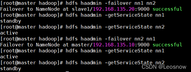 [root@master hadoop]# hdfs haadmin -failover --forcefence -forceactive nn1 nn2 forcefence and forceactive flags not supported with auto-failover enabled. [root@master hadoop]# hdfs haadmin -failover nn1 nn2 Failover to NameNode at slave1/192.168.135.20:9000 successful [root@master hadoop]# hdfs haadmin -getServiceState nn1 standby [root@master hadoop]# hdfs haadmin -getServiceState nn2 active [root@master hadoop]# hdfs haadmin -failover nn2 nn1 Failover to NameNode at master/192.168.135.10:9000 successful [root@master hadoop]# hdfs haadmin -getServiceState nn1 active [root@master hadoop]# hdfs haadmin -getServiceState nn2 standby