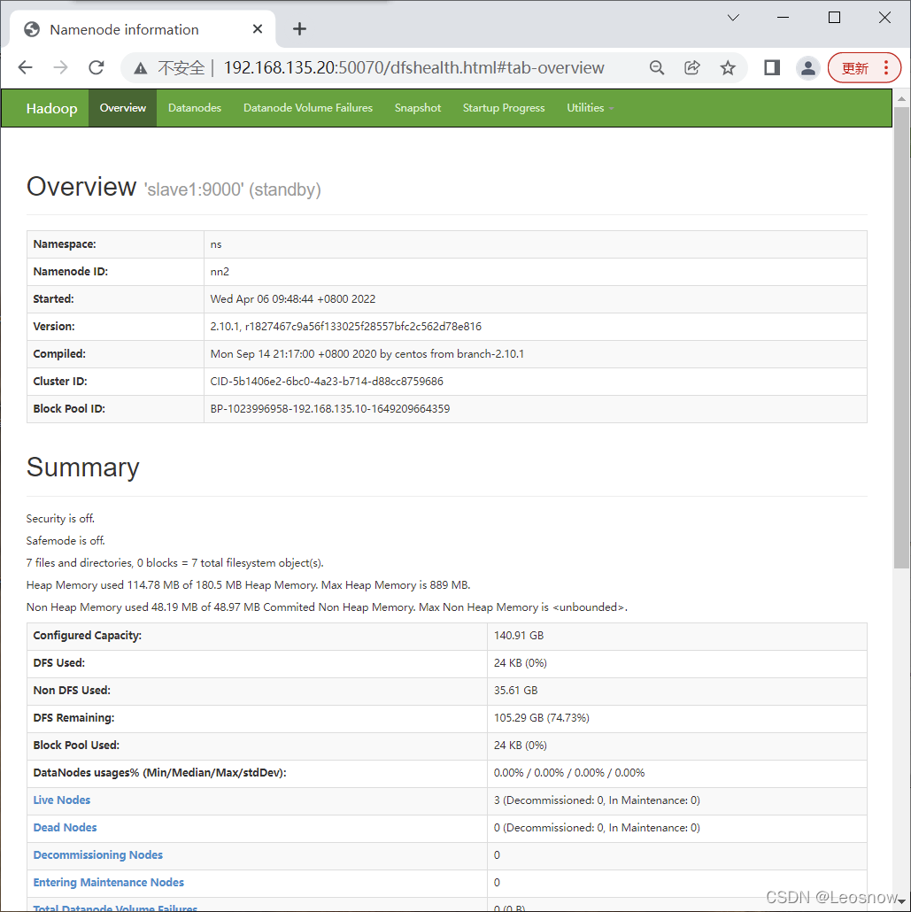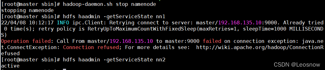 [root@master sbin]# hadoop-daemon.sh stop namenode stopping namenode [root@master sbin]# hdfs haadmin -getServiceState nn1 22/04/08 10:12:17 INFO ipc.Client: Retrying connect to server: master/192.168.135.10:9000. Already tried 0 time(s); retry policy is RetryUpToMaximumCountWithFixedSleep(maxRetries=1, sleepTime=1000 MILLISECONDS) Operation failed: Call From master/192.168.135.10 to master:9000 failed on connection exception: java.net.ConnectException: Connection refused; For more details see: http://wiki.apache.org/hadoop/ConnectionRefused [root@master sbin]# hdfs haadmin -getServiceState nn2 active