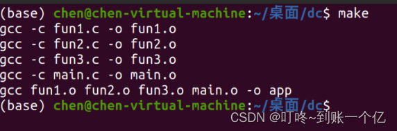 为什么会这样呢?这是因为,我开始的时候,第一行使用的是app:fun1.o fun2.o fun3.o main.o。但是文件没有fun1.o,fun2.o,fun3.o ,main.o这个依赖。后面他就继续往下执行,下面的程序,生成的.o文件。最后利用生成的.o文件当做依赖执行。