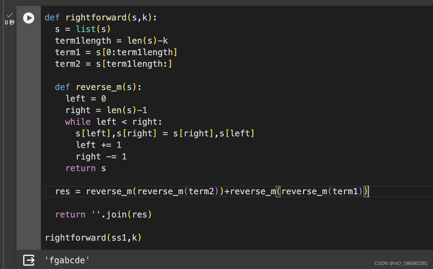 关于这道题卡哥的思路特别的好:把字符串一分为二,各自旋转,然后重新拼接。再转回来。我写完了之后发现python其实可以直接拼接就好...又冗余了。看到正确答案的时候我很震惊。但毕竟我基础不好,又平复心情了。继续加油哟!