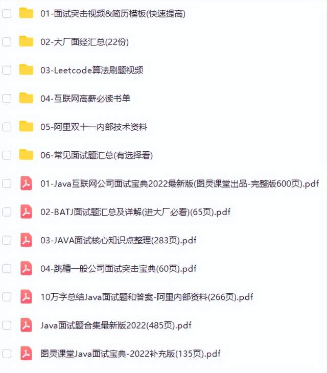 从面试简历模板到大厂面经汇总,从大厂内部技术资料到互联网高薪必读书单,以及Java面试核心知识点(283页)和Java面试题合集2022年最新版(485页)等等,这些技术和面试资料整理给大家,希望面试踩过的坑不要再踩,遭遇的技术瓶颈一次性消灭。