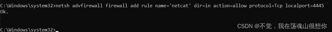netsh advfirewall firewall add rule name='netcat' dir=in action=allow protocol=Tcp localport=4445