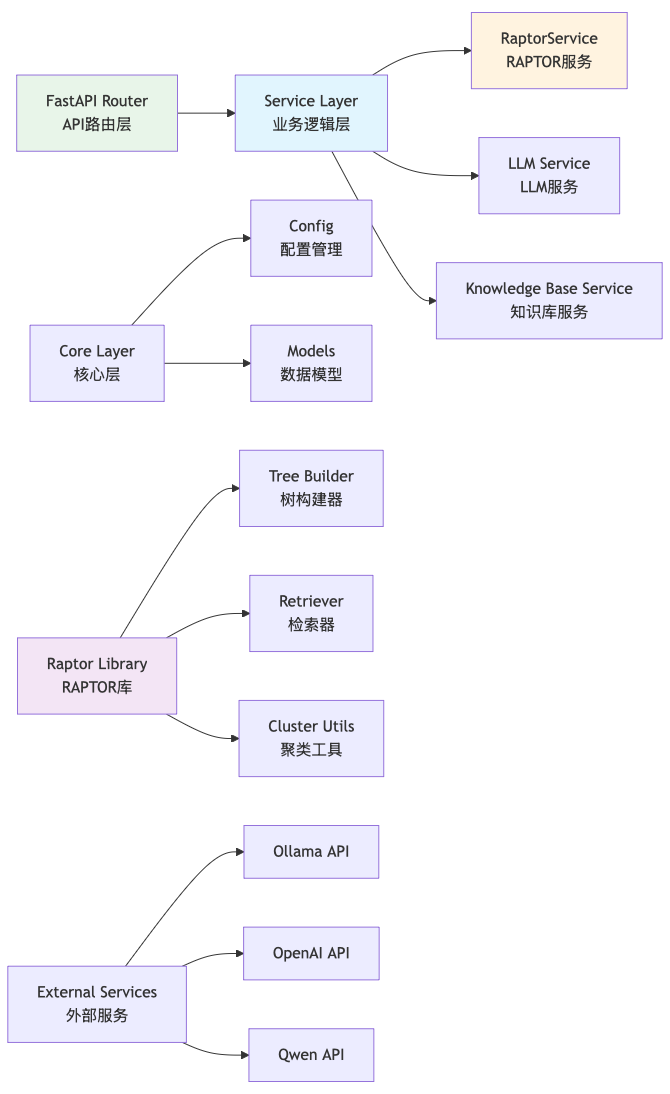 class RaptorService: """RAPTOR服务封装,支持多LLM""" def __init__(self, llm_service=None): self.llm_service = llm_service self.raptor_instance = None asyncdef build_tree(self, documents, document_names=None): """构建RAPTOR树""" # 初始化RAPTOR实例 config = RetrievalAugmentationConfig( embedding_model=OllamaEmbeddingModel(...), tb_summarization_model=OllamaSummarizationModel(...), qa_model=OllamaQAModel(...) ) self.raptor_instance = RetrievalAugmentation(config=config) # 合并文档并构建树 combined_text = "\n\n".join([...]) self.raptor_instance.add_documents(combined_text) self.raptor_instance.save(save_path) asyncdef query(self, query_text, top_k=5): """查询并生成回答""" answer = self.raptor_instance.answer_question( question=query_text ) return [{"content": answer, "score": 1.0}]