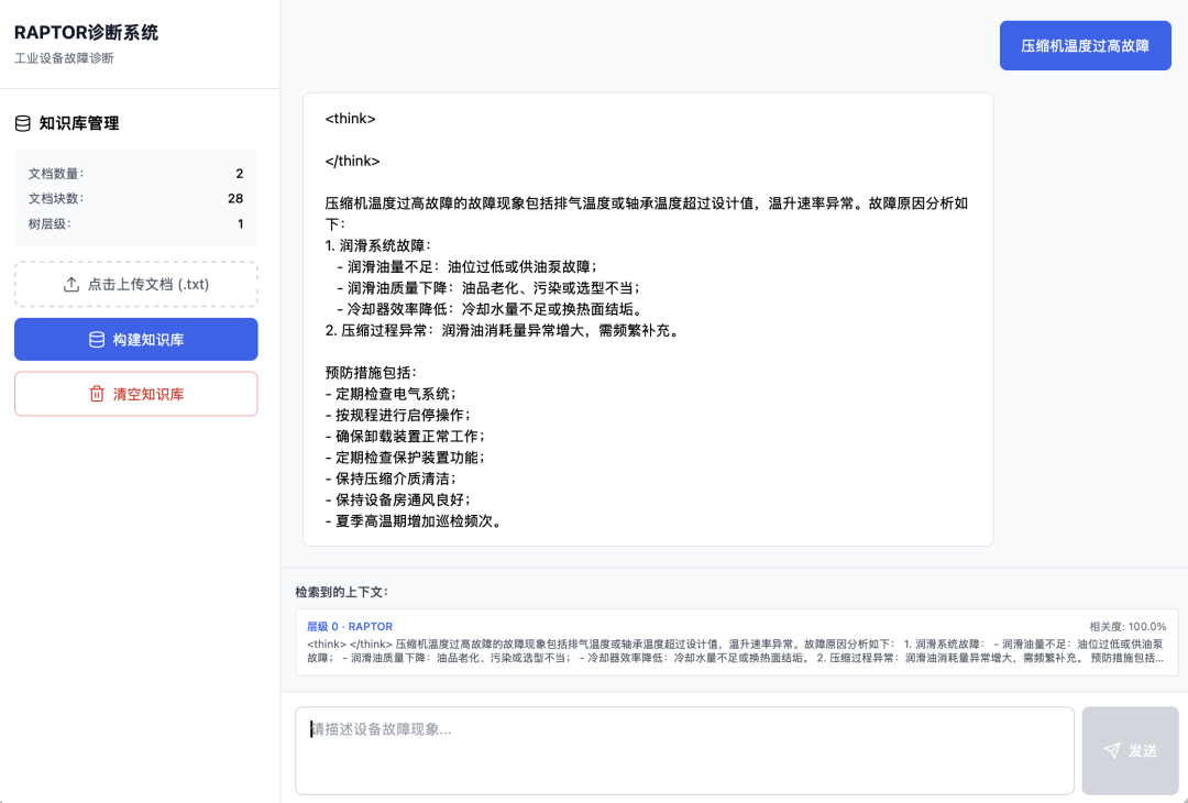 RAPTOR工业设备故障诊断系统通过创新的树形检索技术,结合现代大语言模型的强大能力,为工业设备的智能诊断提供了全新的技术路径。系统不仅实现了RAPTOR的完整功能,还通过多LLM支持、本地化部署等创新特性,大大提升了系统的实用性和可扩展性。